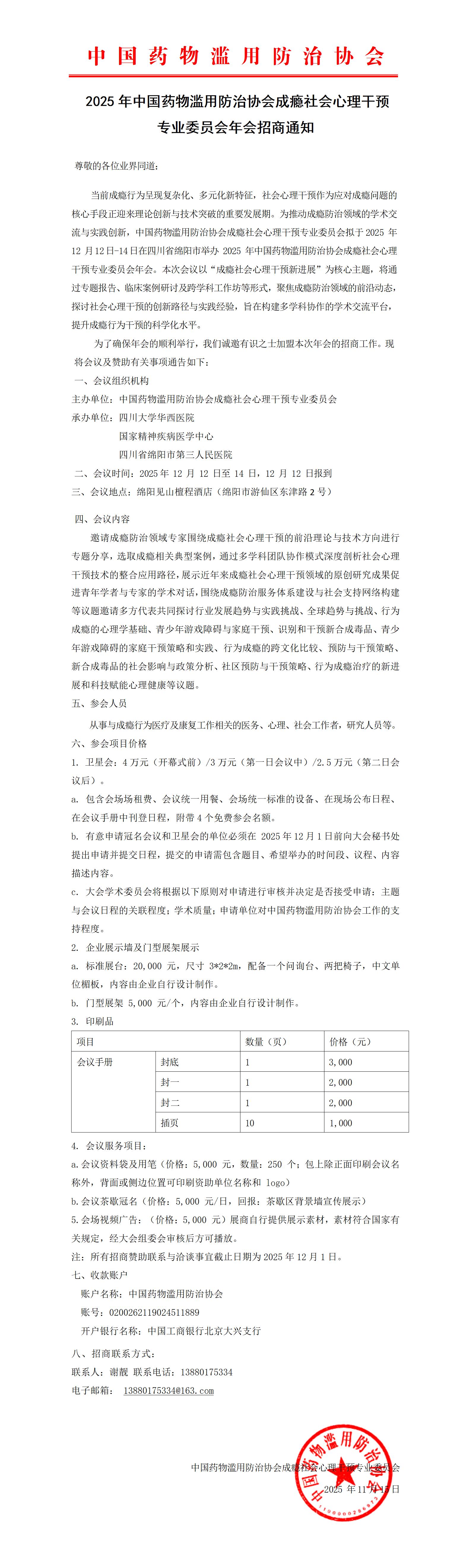 2025 年中国药物滥用防治协会成瘾社会心理干预专业委员会年会招商通知
