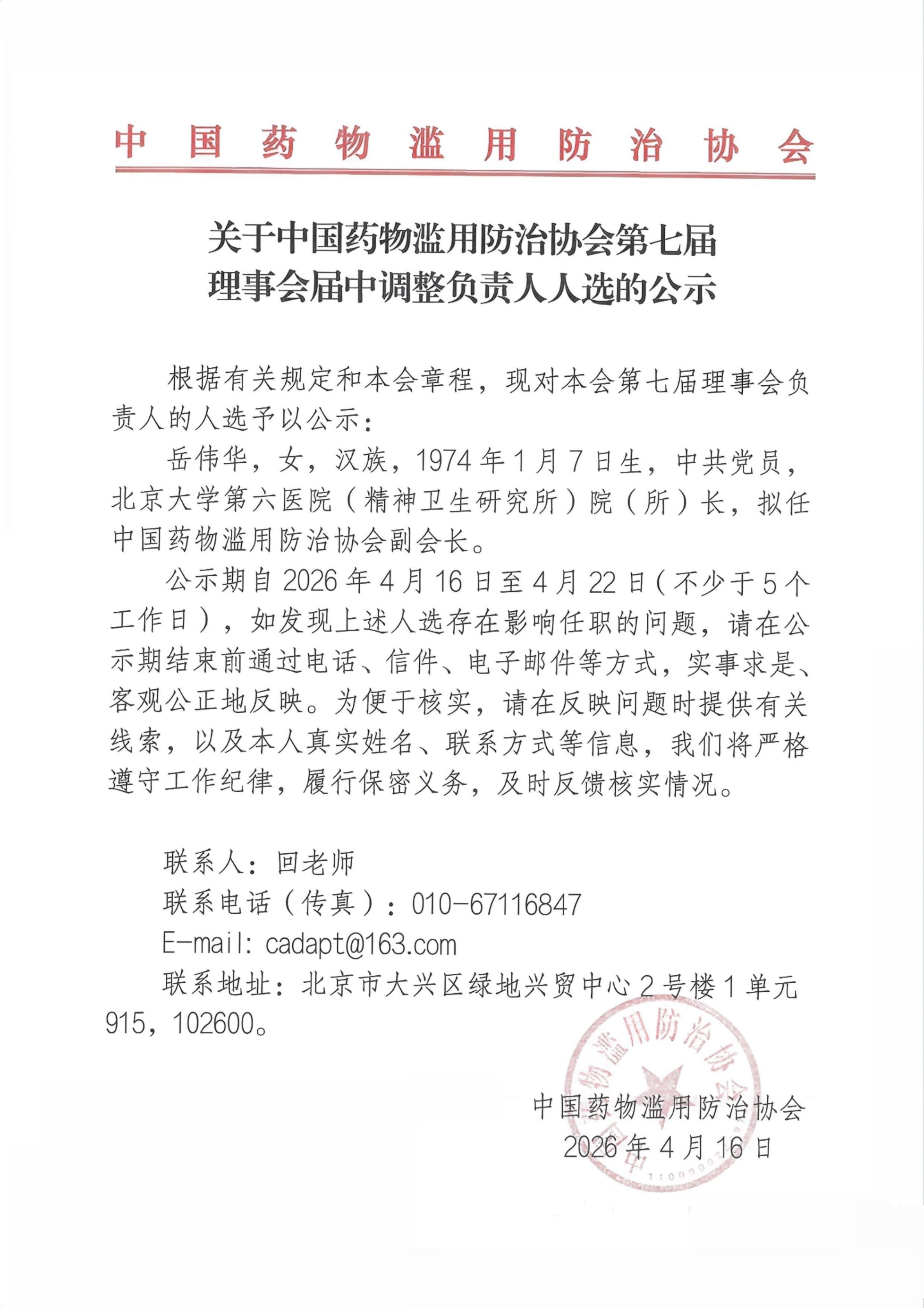 关于中国药物滥用防治协会第七届理事会届中调整负责人人选的公示