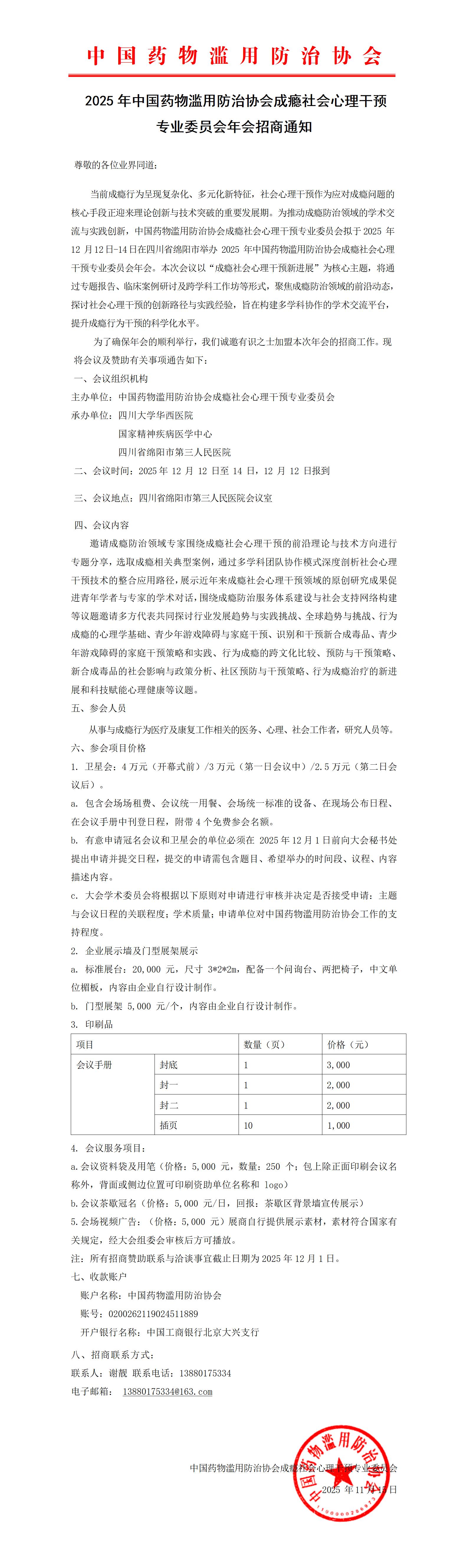 2025 年中国药物滥用防治协会成瘾社会心理干预专业委员会年会招商通知